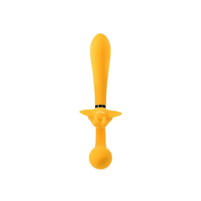 Looking for a toy that can be used solo or partnered? This silicone partner toy is unique because each of its 3 shafts includes their own independently controlled 10-speed motor. The curved, bulbous wearable shaft connects via flexible elbow to a butterfly-shaped stimulator with wide fluttering wings and fluttery antennae to provide different stimulation. Flexible shafts move with your body for comfortable use with or without a harness. A third arched shaft with another bulbous head can be screwed in near the wings for partner play. However, it can easily be removed and capped off for solo time. The toy is rechargeable, water submersible and easy to clean. Cap covers removable shaft port when not in use