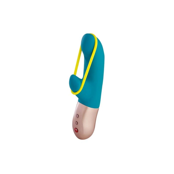The mini vibrator with a taut band. Thrilling and new. Passionate moments bloom as soon as the flexible stimulation band joins forces with the sensitive curves of this little vibrator. Both the silky surface of the silicone shaft and the band pleasure and inspire. With intimate teamwork, the toy’s finesse created by the externally placed stimulation band brings even more excitement to the game and transports users to seventh heaven. The gently taut silicone stimulation band is placed between the softly rounded tip and the side bud for external arousal. It externally stimulates the mound and the vaginal lips — ensuring levels of excitement of a special kind. When used vaginally and anally simply remove the neon yellow band. The gently curved tip of the Amorino easily finds the G and P spot while the curvature on the lower end of the mini-vibrator stimulates the clitoris or anus.